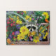 Enjoy this "One Of A Kind" Racoon Puzzle! It Features a Mischievous Racoon in a Wood Box Peeking out of Beautiful Flowers!