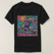 Sunglasses on, backpack strapped, this neon dino catches air against a magenta-teal sunset sky. Grainy halftones and retro hues deliver pure 80s skate-culture energy.