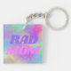Custom keychain for moms featuring "Rad Mum" in purple and pink serif typography with colourful rainbow glitter background.