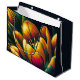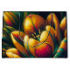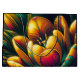 This digital artwork features a vibrant, abstract representation of a tulip in full bloom. The intricate design showcases a mesmerising blend of colours, including vivid yellows, oranges, and hints of teal, creating a stunning visual effect.