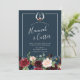Our Radiant Bloom wedding invitation frames your wedding details with a top border of painted watercolor flowers and foliage in rich jewel tones of burgundy marsala, navy blue, cerise, blush and green. A modern yet organic choice in vibrant colours with lush botanicals and your names in handwritten lettering. Personalise with your single initial monogram at the top surrounded by white antlers adorned with matching flowers.