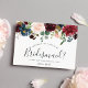 Chic floral bridal party proposal card features a top border of burgundy marsala, blush pink and navy blue flowers, with lush botanical foliage and greenery. Personalise with your bridesmaid request details (shown with "will you be my bridesmaid? I can't say I do without you") in modern hand lettered script and traditional sans serif lettering. Invitations reverse to rich jewel toned navy blue.