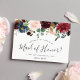 Chic floral bridal party proposal card features a top border of burgundy marsala, blush pink and navy blue flowers, with lush botanical foliage and greenery. Personalise with your maid of honour request details (shown with "will you be my maid of honour? I can't say I do without you") in modern hand lettered script and traditional sans serif lettering. Invitations reverse to rich jewel toned navy blue.