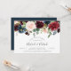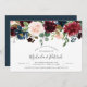 Chic floral engagement party invitation features a top border of burgundy marsala, blush pink, and navy blue flowers, with lush botanical foliage and greenery. Personalise with your engagement party details in modern hand lettered script and traditional sans serif lettering. Invitations reverse to rich navy blue.