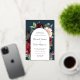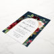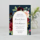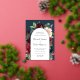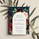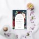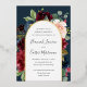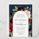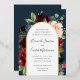 Our Radiant Bloom wedding invitation surrounds your wedding day details with an arch of painted watercolor flowers in burgundy marsala, blush pink and navy blue, with green botanical foliage and eucalyptus leaves. A beautiful choice in lush, saturated colours for fall or winter weddings, with luxe gold foil trim.