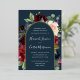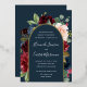 Our Radiant Bloom wedding invitation surrounds your wedding day details with an arch of painted watercolor flowers in burgundy marsala, blush pink and navy blue, with green botanical foliage and eucalyptus leaves. A beautiful choice in lush, saturated colours for fall or winter weddings, with luxe gold foil trim.