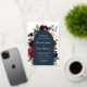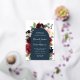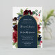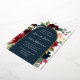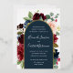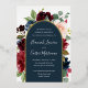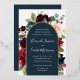 Our Radiant Bloom wedding invitation surrounds your wedding day details with an arch of painted watercolor flowers in burgundy marsala, blush pink and navy blue, with green botanical foliage and eucalyptus leaves. A beautiful choice in lush, saturated colours for fall or winter weddings, with luxe gold foil trim.