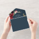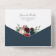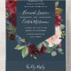 Our Radiant Bloom wedding invitation surrounds your wedding day details with a geometric frame of painted watercolor flowers in burgundy marsala, blush pink and navy blue, with green botanical foliage and eucalyptus leaves. A beautiful choice in lush, saturated colours for fall or winter weddings, this design features a detachable RSVP section with a QR code for guests to scan.