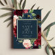 Our Radiant Bloom wedding save the date frames your wedding details with an elegant square border of lush watercolor foliage and flowers in blush pink, burgundy plum and dusty blue, with real gold foil trim on a rich navy blue background.