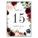 Garden chic table number cards feature an oval wreath border of green watercolor foliage and vibrantly coloured flowers in blush pink, burgundy marsala and navy blue, framing your table number in rich off-black. Personalise with your names and wedding date, or name each table for an extra personal touch. Design repeats on reverse side. Coordinates with our Radiant Bloom floral wedding invitation suite.
