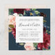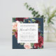 Our Radiant Bloom floral rehearsal dinner invitation in a unique square format frames your wedding ceremony rehearsal and dinner details with painted watercolor flowers in blush pink, burgundy marsala and navy blue, with green eucalyptus foliage against a rich navy background.