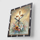 This stunning square wall clock features a glowing wooden cross, emitting rays of divine light against a radiant sky. The base is adorned with a lush array of vibrant flowers, including a prominent white lily, sunflower, and various pink and blue blossoms, symbolising faith, hope, and natural beauty.