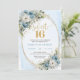Celebrate a milestone moment with this elegant Sweet Sixteen invitation, featuring a refined watercolor design of dusty blue florals blended with soft white flowers and fresh eucalyptus greenery. Framed by a shimmering gold glitter border and paired with graceful script lettering, this invitation sets a sophisticated tone for a truly unforgettable Sweet Sixteen, Sweet 16th, or 16th birthday celebration.