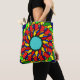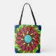 This vibrant mandala-style colorful tote bas features intricate, symmetrical patterns bursting with color. The design radiates energy with vivid hues of green, blue, red, orange, and yellow, creating a harmonious blend that draws the eye, making this piece a perfect addition to any outfit.