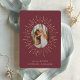 Share holiday greetings with these chic and minimalist Christmas photo cards featuring your favourite vertical or portrait orientated photo, framed by a hand drawn sunburst illustration in gold foil on elegant cranberry red. "Always merry" appears beneath in white serif and italic lettering. Personalise with your custom greeting and names beneath. An elegant holiday card with a modern and minimal aesthetic that lets your favourite photo shine.
