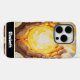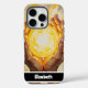 Vibrant phone case design depicting hands holding a glowing yellow circle, showcasing creativity and warmth. Personalised name detail adds a touch of individuality, making it a great accessory or gift choice.