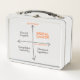 This is a standard metal lunchbox that appears to work just fine. We designed this box ourselves with an uploaded photo and custom text on the front and back. It looks absolutely beautiful except the front of the lunchbox is not centered like it shows in the photo. The print borders don't align with the inset flat part of the box where the preview photo online showed it perfectly centered in there. The back looks nice and centered though.