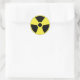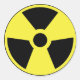 The international symbol for radiation also called a trefoil. A black design against a yellow background.