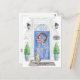 Announce your new address with our stylish announcement featuring a Ragamuffin cat, blue front door, welcome mat, slate sign, topiaries and a floral wreath set on a grey brick background.