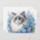 This floral Ragdoll postcard features a vibrant floral watercolor illustration of the long-haired, blue-eyed cat framed by a delicate wreath of soft blue and lavender forget-me-not flowers. The cat’s lifelike fur, expressive crystal-blue eyes, and the lush arrangement of blossoms create a gentle, heartwarming aesthetic that blends realism with floral fantasy.