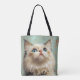 A close-up portrait of a Ragdoll kitten with striking blue eyes. The cat has a fluffy, white coat and is wearing a black collar with a blue gemstone charm. The cat's eyes are wide open and focused on something off-camera, creating a sense of curiosity and wonder. The background is a soft, pastel blue with delicate pink blossoms scattered throughout, adding a touch of whimsy and elegance to the image.