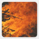 A pile of silhouetted sticks on the left side of the image burn hotly. Mesmerising dark orange and yellow flames fill most of the photograph's frame. Wind pushes the torrent of fire so it angles diagonally up to the right.