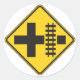 This design is a railway crossing road sign. The sign is yellow with a railway crossing and tracks. This railway crossing road sign design looks great on this Stickers