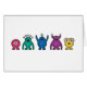 a family of cute / kawaii alien monster cartoon / illustrations in rainbow colours (pink, green, blue, purple and yellow)