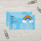A cute business card eaturing a stunning vivid vector rainbow on a blue background. It curves to meet to white fluffy clouds on each side. The right cloud has a pink heart decorating it. It rain downs 4 yellow stars and 6 blue raindrops.