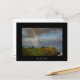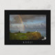 Postcard of a rainbow and some dark grey rain clouds over Kilauea Lighthouse on a promontory in the Pacific Ocean on the North Shore of Kauai, Hawaii, USA with a black border and the text: 'Kauai'.
