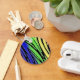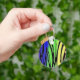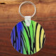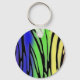 Custom Basic Button Keychain has a black and rainbow coloured zebra or tiger stripes pattern.