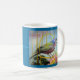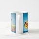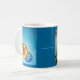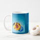 Details of original oil painting by Joy Kreves, with images of a painted bunting bird, rainbow, birdcage, and floating spheres reproduced on a mug.
