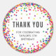 Rainbow Birthday Party Thank You Stickers with personalised text and colourful confetti around the edge