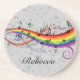 Black musical notes floating on a rainbow of swirling rainbow colours. The background is grey musical notes on a lighter shade. Add your own personalised name to create a unique gift for the music lover.