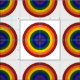Stylish geometric fabric features concentric circles forming rainbow coloured bullseyes. The outermost circle is red, followed by orange, yellow, green, blue, indigo, and ending with violet in the centre. Make accessories that celebrate your LGBTQ pride or your love of rainbow colours.