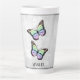 Enjoy your latte or morning coffee with a Rainbow Butterfly Floral Personalised Latte Mug. Mug design features a pair of vibrant butterflies resting on a white floral vine against a light grey grunge background. Additional gift items available with this design as well as a variety of colours.