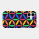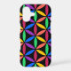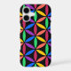 Abstract geometric design of interlacing circles, bright rainbow colours on black background