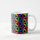 Abstract geometric design of interlacing circles, bright rainbow colours on black background