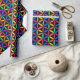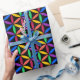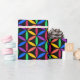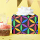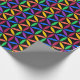 Abstract geometric design of interlacing circles, bright rainbow colours on black background