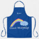 This is a royal blue apron to wear in the mornings, which can be personalised with your name. It is decorated with a simple image of a rainbow with a cloud and raindrops falling over the words "Good Morning!", in white lettering. It comes in a choice of three sizes, small, medium and large.