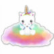 A gorgeous unicorn sticker featuring a cute little baby unicorn with a shiny golden horn, sitting on a rainbow cloud. She also has a small pair of wings.