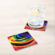 This set of colourful paper coasters features an abstract three dimensional pattern of rainbow crescent moons in colours of red, orange, yellow, green, blue and purple on a black background.