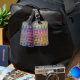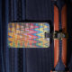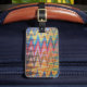 Rainbow coloured luggage tag in Swoon pattern.