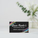 Fun rainbow coloured crocheted stitched yarn strings with crochet hooks on this business card for yarn crafters, personalised with your choice of colours throughout.