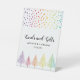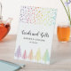 Rainbow colours colourful trees and confetti LGBT wedding Cards and Gifts pedestal sign. It features colourful trees and confetti in rainbow colours on white background.