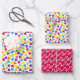 These wrapping paper sheet features multicolored hearts in a confetti pattern, with two sheets having different size hearts and the third in pink with white text / name, which can be personalised.