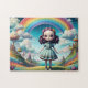 This jigsaw puzzle is a whimsical scene of a young girl in a rainbow theme landscape.