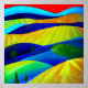 An abstract landscape of rolling hills in bright vibrant colours with angular lines.