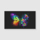 Rainbow, luminous, artistically painted monarch butterfly with bouquet of iridescent, bright, luminescent roses on black background. Rainbow butterfly.