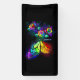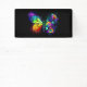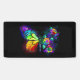 Rainbow, luminous, artistically painted monarch butterfly with bouquet of iridescent, bright, luminescent roses on black background. Rainbow butterfly.